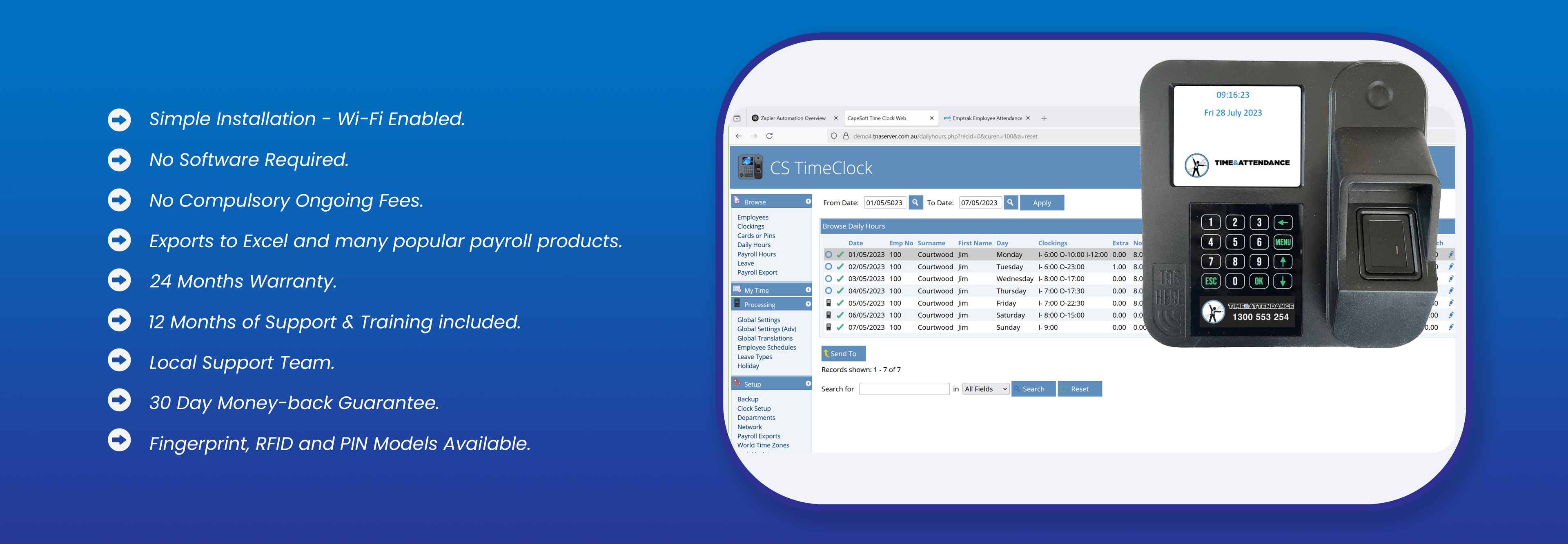 The CS Time Clock is simple to install, requires no software, is fully supported by local trained staff who will assist you in setting up the clock, adding your employees and provide all the training you require to have your system up and running in just a few hours.